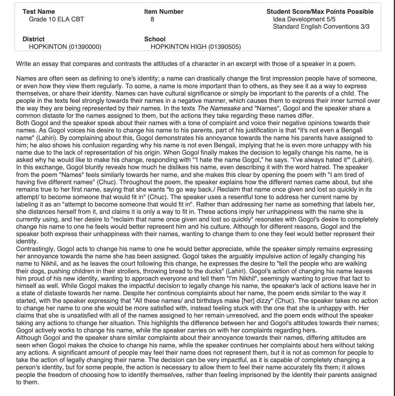 IF YOU ARE BEING INVITED TO “COMPARE AND CONTRAST,” (e.g. Based on The Namesake and “Names,” write an essay that compares and contrasts Gogol’s and the speaker’s attitudes toward their names. Be sure to use details from both the excerpt and the poem to develop your essay), this can be tricky… the prompt COULD be answered correctly if you show DIFFERENCES, *OR* if you show SIMILARITIES AND DIFFERENCES. The only wrong choice here is to neglect the “contrast” part of the prompt. Because of this potential mistake, we suggest you first brainstorm the differences and THEN consider including similarities. When you structure a compare-and-contrast essay, it might make sense to dedicate a paragraph to showing similarities and another paragraph to showing differences, introducing both texts in your first body paragraph. This type of essay might benefit from a two-sentence thesis – one sentence to set up the similarity, a second sentence explaining the difference.